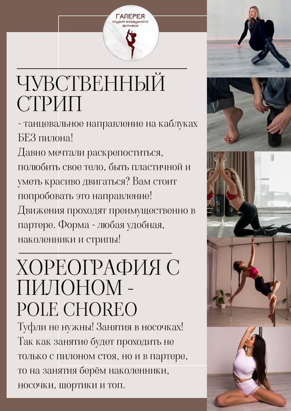 Также здесь занятия проводят тренеры по танцам - настоящие профессионалы своего дела, которые стараются развивать потенциал каждого ученика. А что как не танец помогает развить такие разные качества: и пластику, и координацию, и, конечно, ритмичность! Мы преподаём сразу несколько стилей: стрип-пластику и пол-дэнс. Мы с лёгкостью обучим вас, уделяя внимание технике движений и непременно подаче.