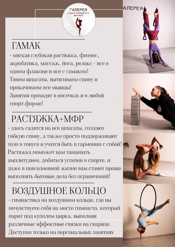 Чувствовать себя превосходно значит быть по-настоящему здоровым. Студия воздушного фитнеса Галерея стойко работает над тем, чтобы дарить вам энергию и красоту.